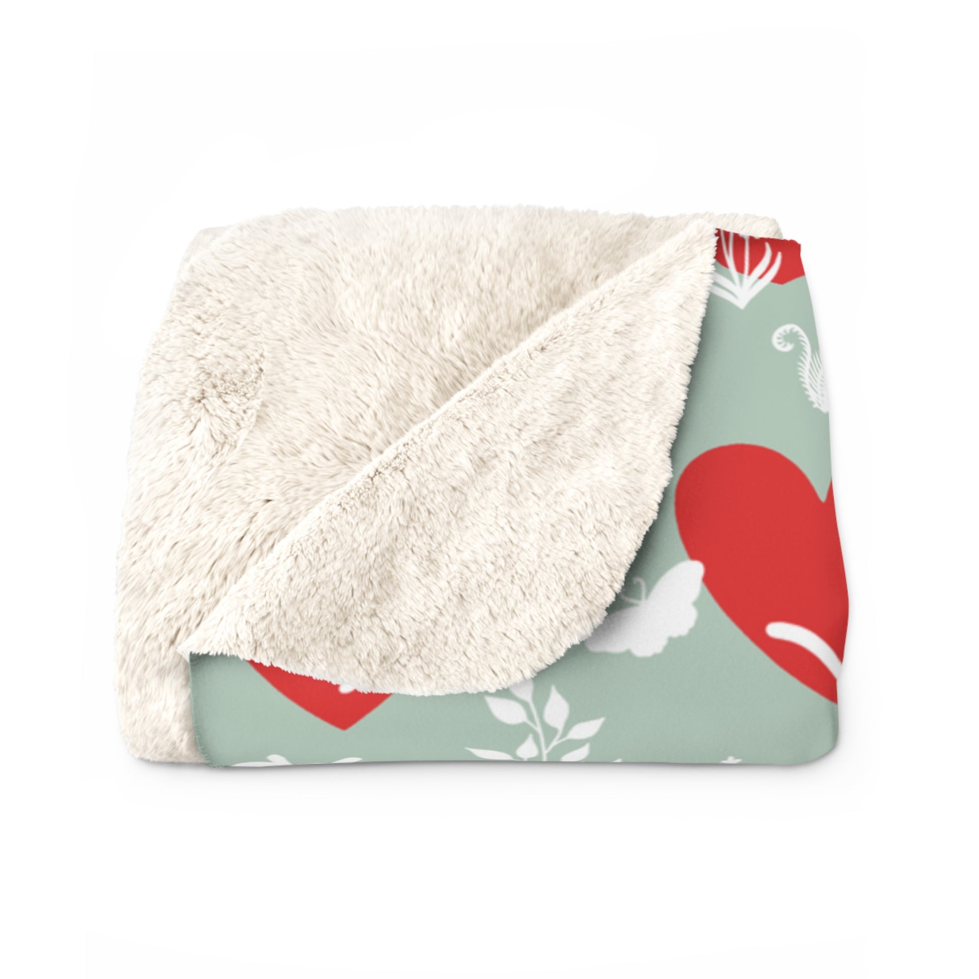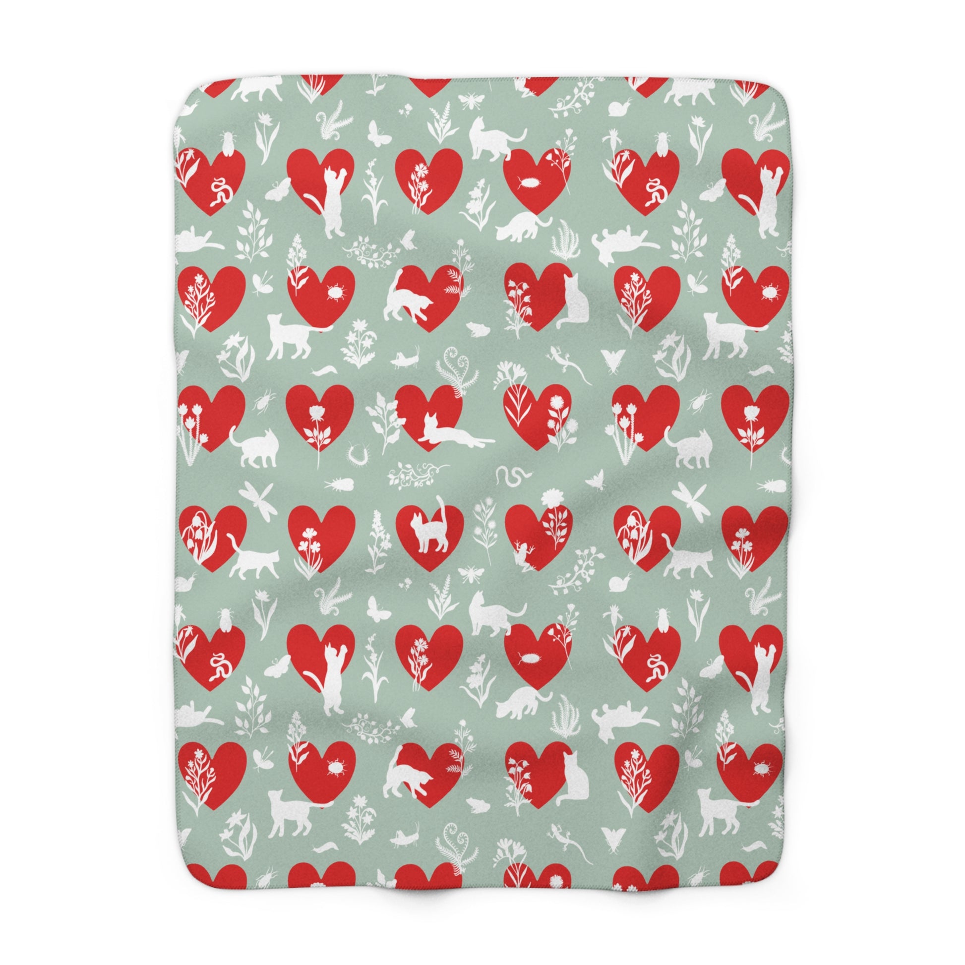 'Heart Cats' Sherpa Fleece Blanket, Seafoam&Red